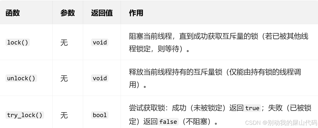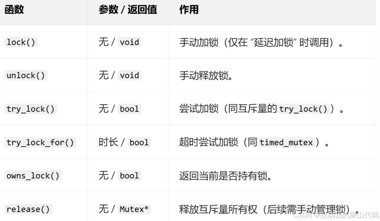 核心成员函数:包含recursive_mutex的所有函数 + timed_mutex的try_lock_for()/try_lock_until()。