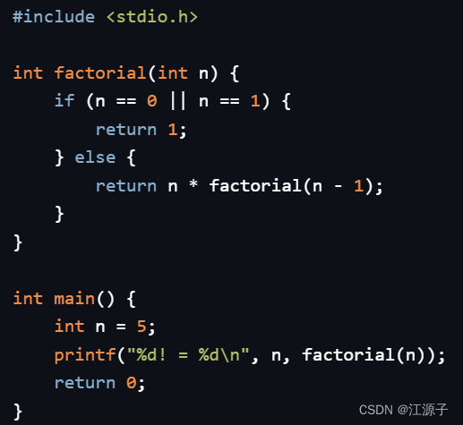 这段代码计算了5的阶乘。函数递归的方法是,如果n等于0或1,则阶乘为1。否则,阶乘为n乘以(n-1)的阶乘。在函数中调用自身,每次递归时,n的值减1,直到n等于0或1为止。然后每个递归步骤都将返回结果,直到函数最终返回阶乘结果。