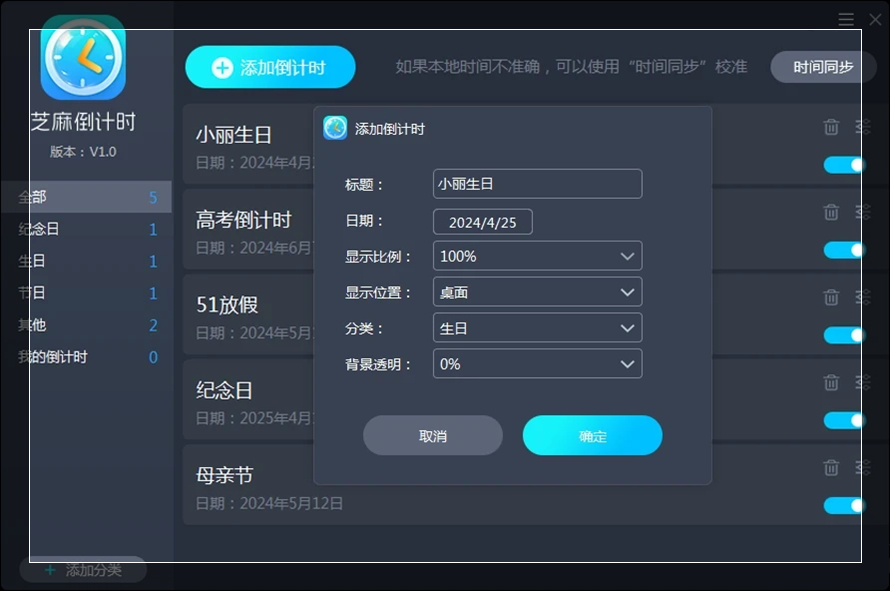 3、简洁易用:操作界面简洁明了,一键添加、编辑和删除倒计时,让你轻松管理所有重要日期。同时,开关按钮设计合理,方便你在桌面上随时开启或关闭倒计时显示。