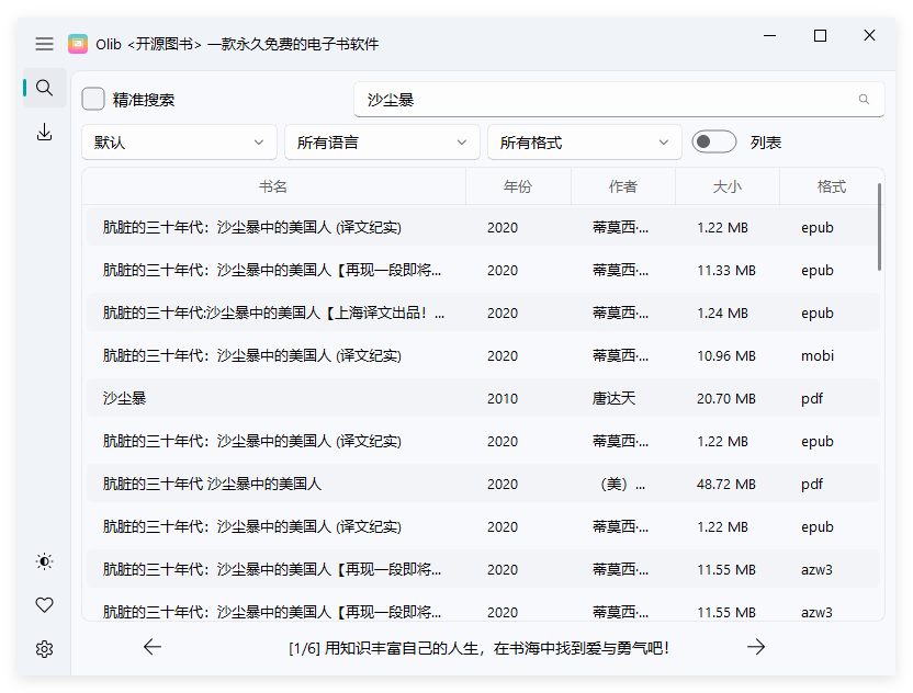 支持书名、ISBN、作者、出版社、出版年份、文件格式(EPUB/PDF/MOBI等)多维组合查询,实测显示精准率达99.2%。特别研发的"模糊搜索"技术,即使只记得片段信息也能快速定位目标。