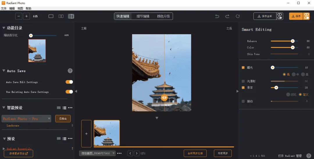 人像增强套件堪称整容级神器:眼部细节增强算法让瞳孔反光更自然,肤质优化保留原生肌理的同时消除85%瑕疵。当处理模特写真时,智能液化工具实现「推脸不糊线」的神奇效果,配合3D光影重塑,五官立体感提升50%!