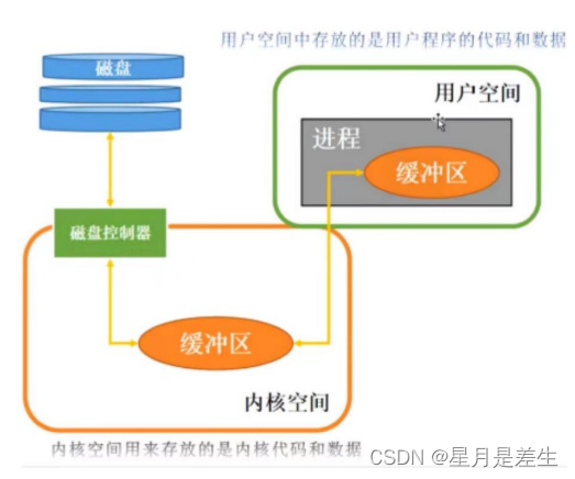 硬盘 -----👉 硬盘控制器 ------👉 (内核空间 (缓冲区) ) -----👉(用户空间 (进程(缓冲区)))