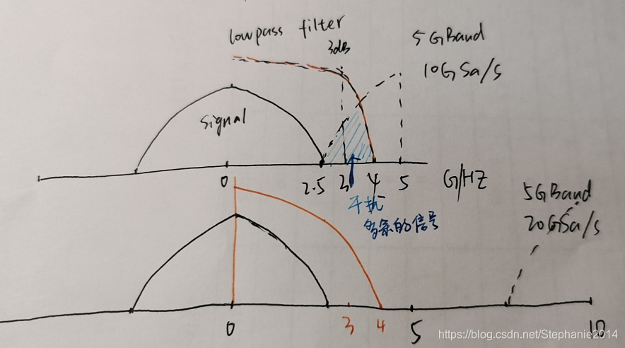 基带信号符号速率5GBaud,正半轴占2.5GHz,对于10GSa/s的采样率,在频谱上信号频谱以5GHz为周期进行周期延拓