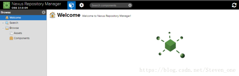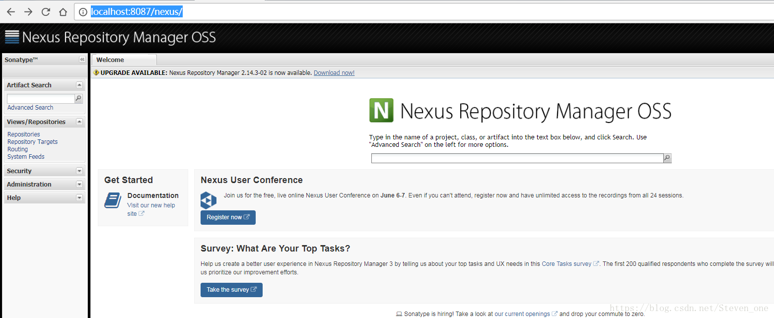 如果出现neuxs started恭喜你启动成功可以打开浏览器输入网址:http://localhost:8087/nexus,由于我的端口8081被占用,所以修改了8087.输入后,按回车,进入如下界面: