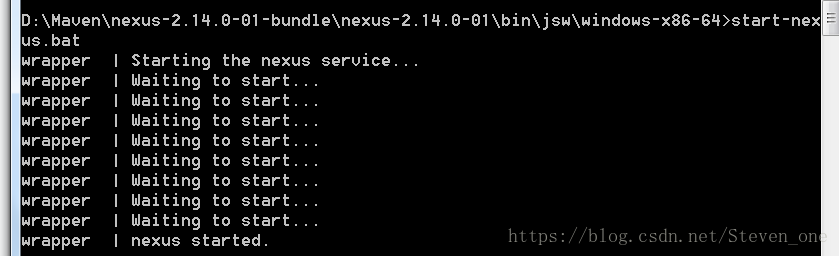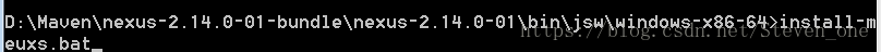 执行:install-mexus.bat 也就是D:\Maven\nexus-2.14.0-01-bundle\nexus-2.14.0-01\bin\jsw\windows-x86-64目录下的东东,当然也可以用nexus install执行,没问题,两种方式任选其一。