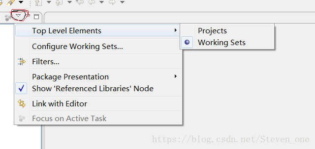 2、接下来 找到package Explorer左边的倒三角,点击第一项的working sets;