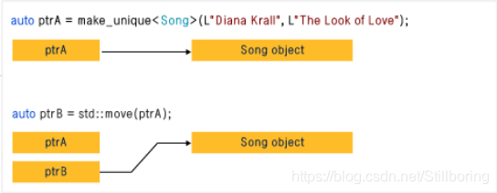 下图演示了两个 unique_ptr 实例之间的所有权转换。