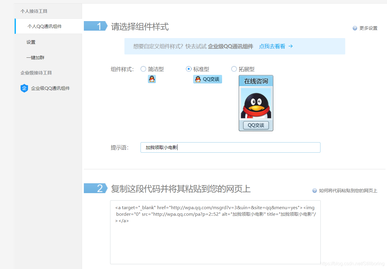这里还可以使用qq推广,在页面上生成一个qq链接,点击后可以与链接设定的人聊天