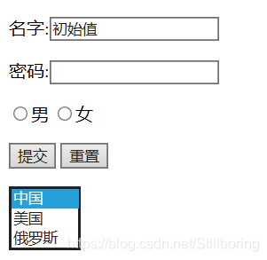 <option value="中国" selected>中国</option><!--selected-->指的是初始默认选项