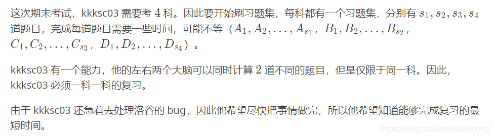 思路分析:看到这道题第一反应是贪心,对于同一科作业只需要把完成所有题花费的时间分成两份t1,t2,使这|t1-t2|最小,然后该科花费的最少时间就是max{t1,t2}。