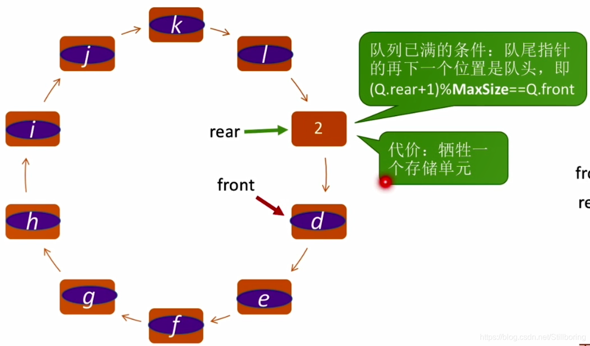 如何判断队列已满呢?当rear的下一个位置为front时,说明队列已满。这里必须牺牲掉最后一个存储单元。