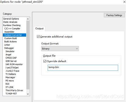 生成bin文件:勾选Generate additional output,Output format选择 binary 选项;Override default 是否选择覆盖,根据自己需求选择,在框中填入要生成的名字,后缀为bin。