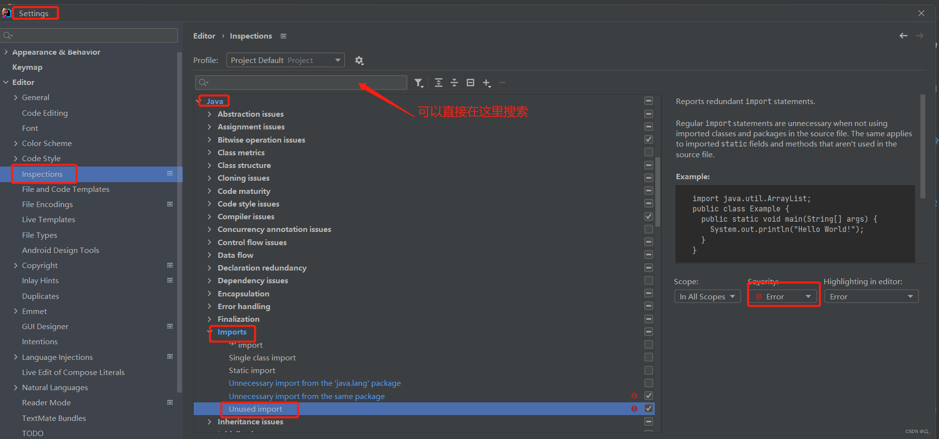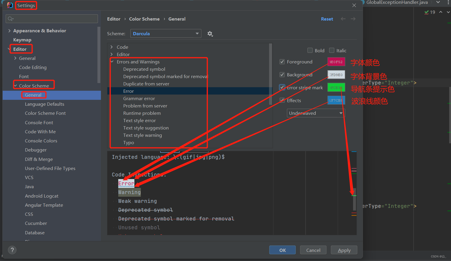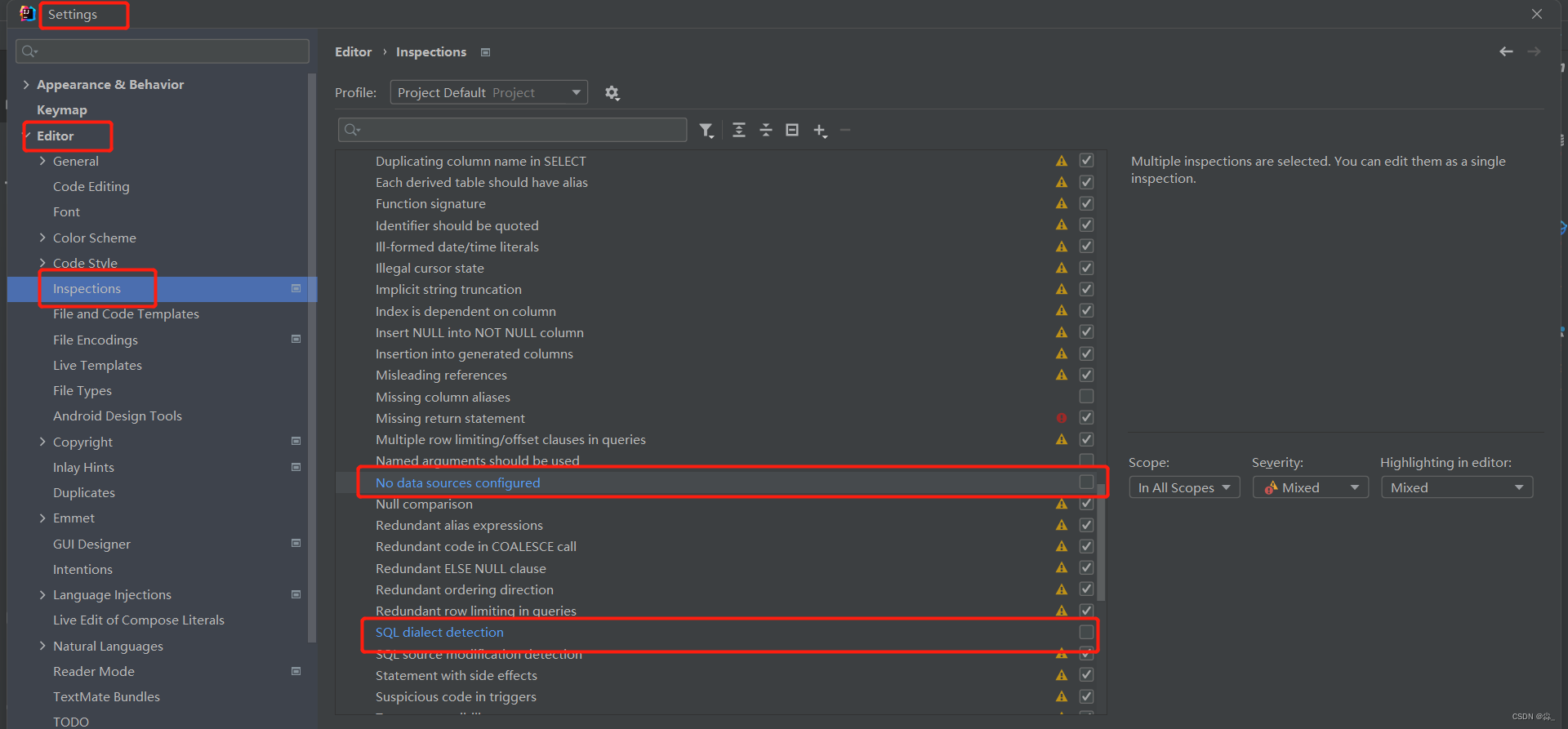 去掉波浪线警告,可以根据自己的需求设置或取消警示, 每个选项都可以设置, 设置完直接apply就能看到效果, 如果设置完没变有可能是该选项不是控制这块的.
