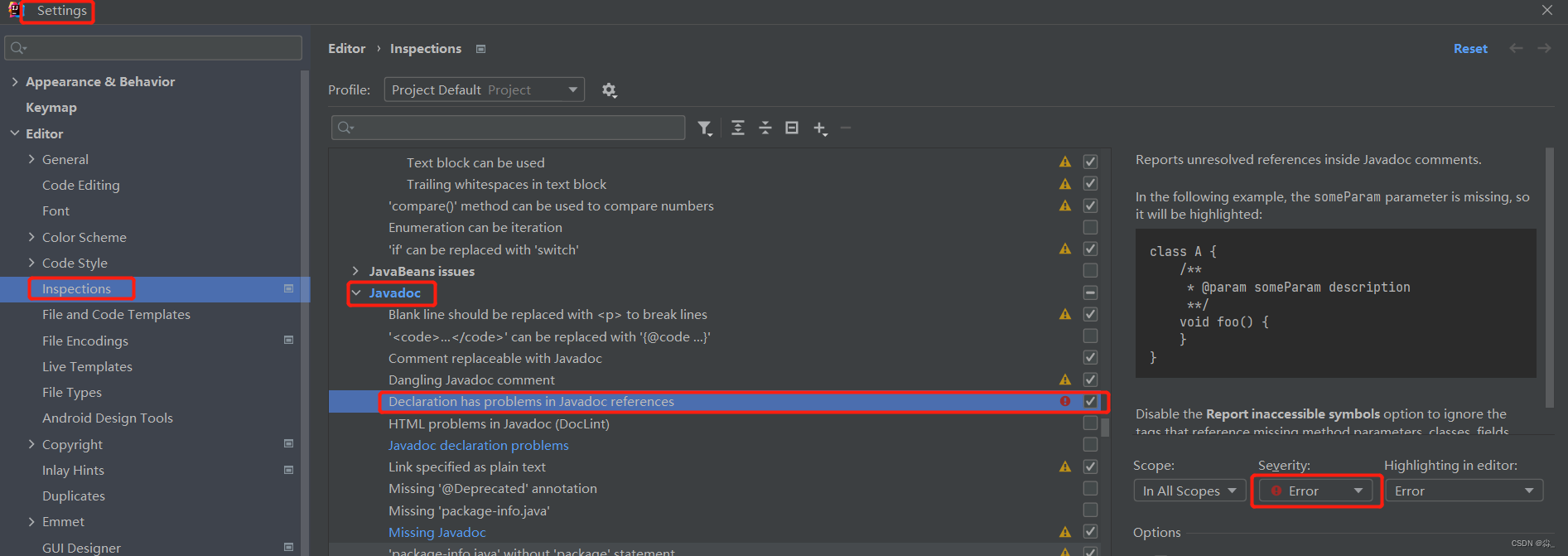 File -> Settings -> Editor -> Inspections -> declaration has problems in javadoc references