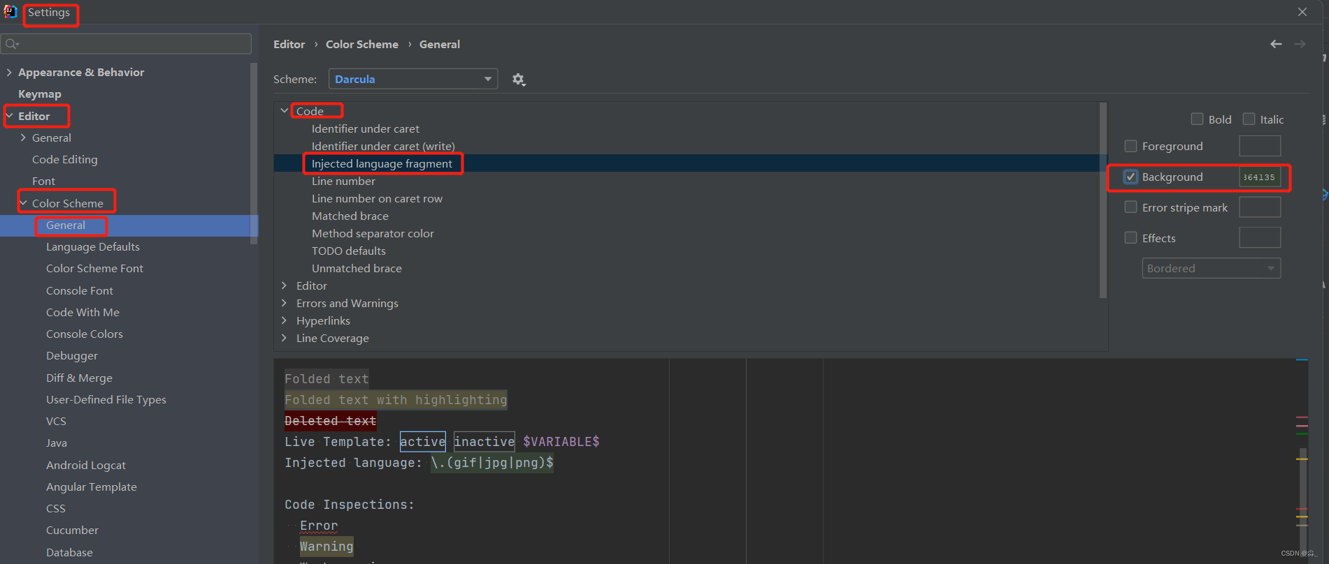 File->Settings->Editor->Color Scheme ->General->Code->Injected language fragment->Background 勾选掉 去掉绿色背景色