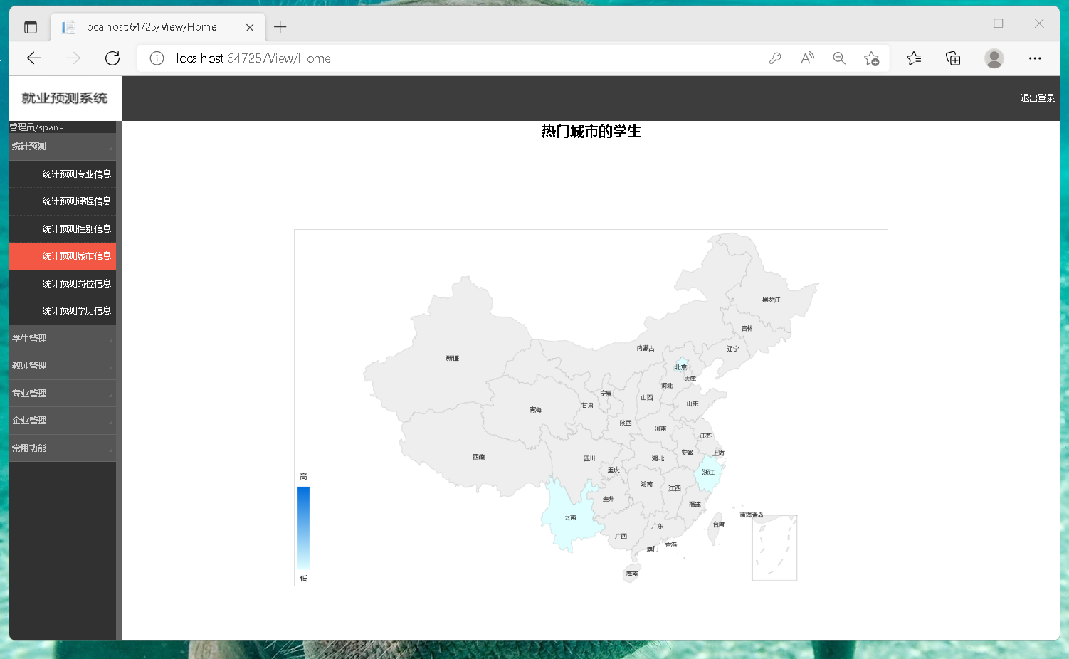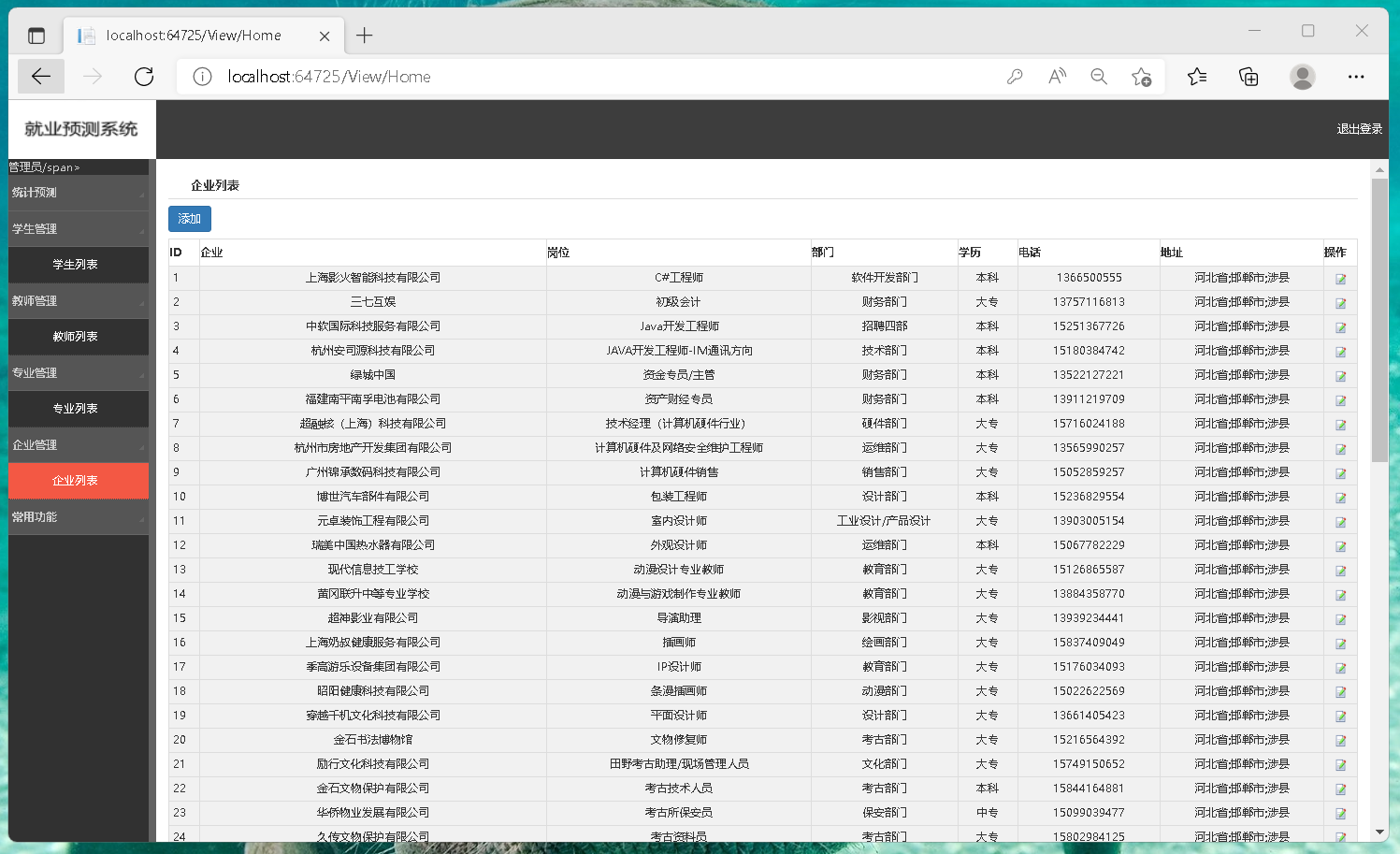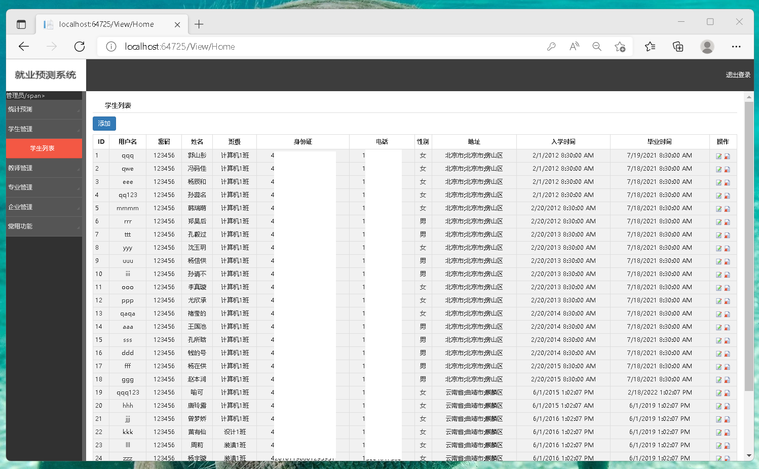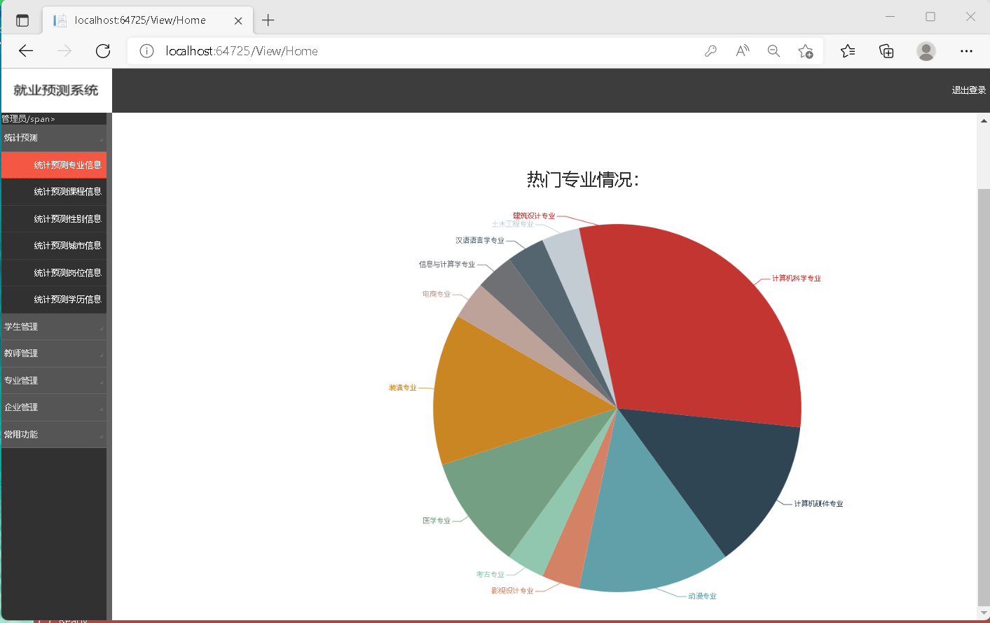 咱们做这个就业预测和成绩管理系统时,一开始就琢磨着得让数据流转顺溜。框架使用aspnet webforml搭页面确实,c#后台逻辑写起来也顺手。成绩管理这块,咱们把复杂的就业统计计算都塞到sqlserver存储过程里,调用起来又快又稳,比在代码里循环算省事儿多了。就业预测要可视化,echart是真好用,试了好几种图表样式,折线图看趋势,柱状图比对比,调了几次参数才让展示效果清晰。最关键是把成绩数据和预测统计关联起来就行。