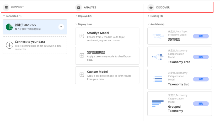 快速添加Stratifyd AI模型、定向监控模型或自定义模型,充分释放数据科学力量。