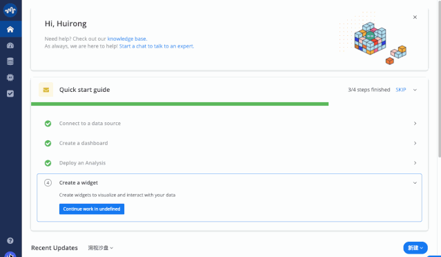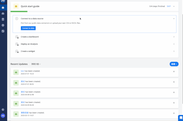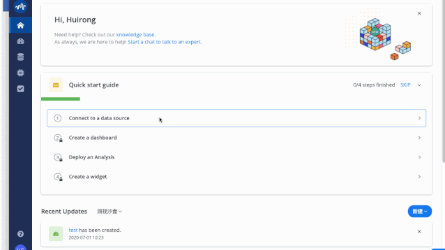 登录平台后映入眼帘的是焕然一新的主页,在这里你可以发现有一个《快速入门指南》,带领新用户快速完成从数据连接、分析模型部署到创建可视化图表的每一步操作。无论您是首次登录平台的用户,还是想邀请其他成员加入数据分析团队,《快速入门指南》都可以引领新用户快速开启数据分析之旅。