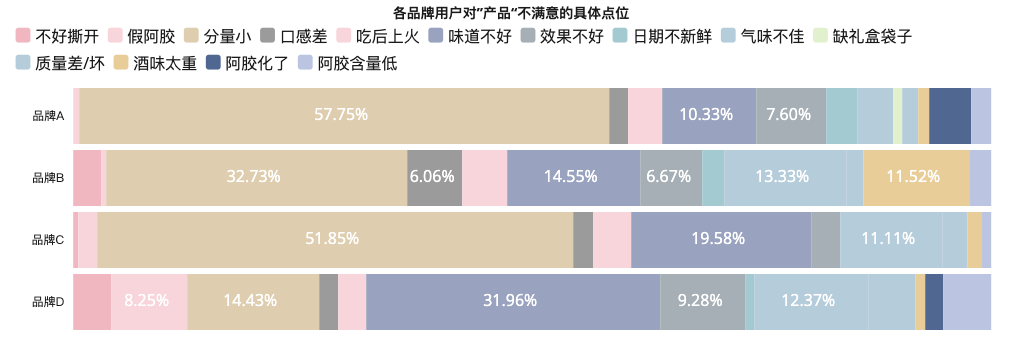通过对四个主流阿胶品牌用户的对比分析,我们发现,用户对各个品牌的不满意点位也存在较大差异:
