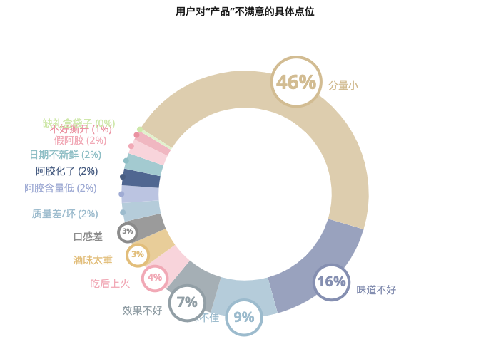 总体而言,“分量小”(46%)是用户吐槽比较多的产品问题。其次,“味道不好”(16%)、“口感不佳”(9%)、“效果不好”(7%)的问题也比较突出,需要品牌方重点关注,在日后的产品迭代中进一步完善、优化。