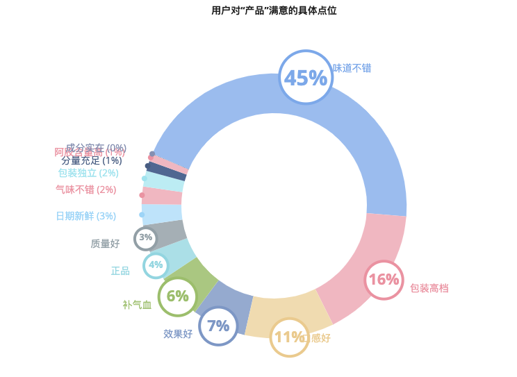 从细分数据结果来看,用户点评的产品优点主要集中在“味道”(45%)、“包装”(16%)、“口感”(11%)3个方面。其次“效果好”(7%)、“补气血”(6%)、“正品”(4%)等方面也是用户提及较多的优点,这是品牌方在今后的市场宣传中要着力重点推广的方向。