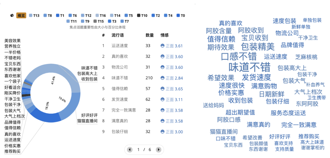 通过NLU话题聚类,阿胶品牌方不仅可以了解当下消费者的热议重点,还能快速确立影响用户体验的主要因素,为下一步分析决策提供依据。从具体数据来看,“味道”、“口感”、“包装”、“配送”、“品牌”等话题是用户关注的焦点。