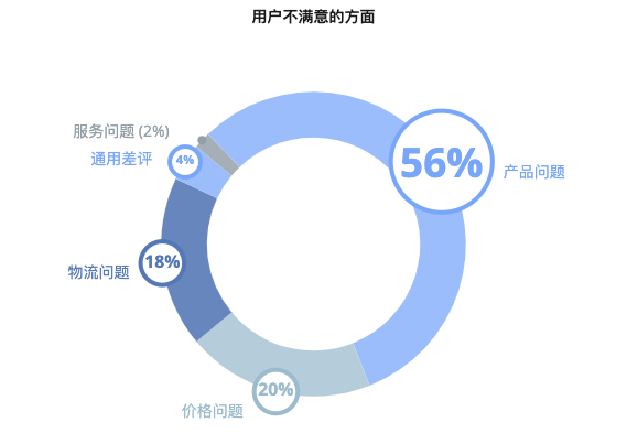 阿胶用户提及的不满意度点位中,产品问题尤其突出,占比达到56%;其次主要是价格问题(20%)和物流问题(18%)。