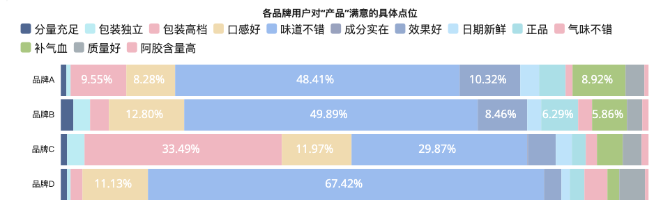 通过对四个主流阿胶品牌用户的对比分析,我们发现,用户对各个品牌的满意点位存在较大差异:
