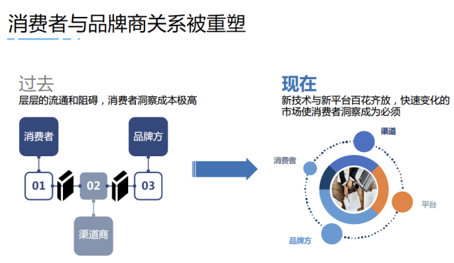 过去,信息流通的成本是非常高的。过去的消费模式是人选商品,因为商品是有限的,品牌商生产出来的商品可能要经过层层的分销才能触达最终的消费者,这种情况下数据是不互通的,包括物流、线上技术等还没有发展起来。彼时,我们要非常依赖于渠道商,依赖于市场调研公司,那样我们做消费者洞察成本是极高的。但是当时也有一个客观原因,就是我们没有很强的动力去洞察我们的消费者,我们更多的是做出更多有性价比的商品提供给消费者。