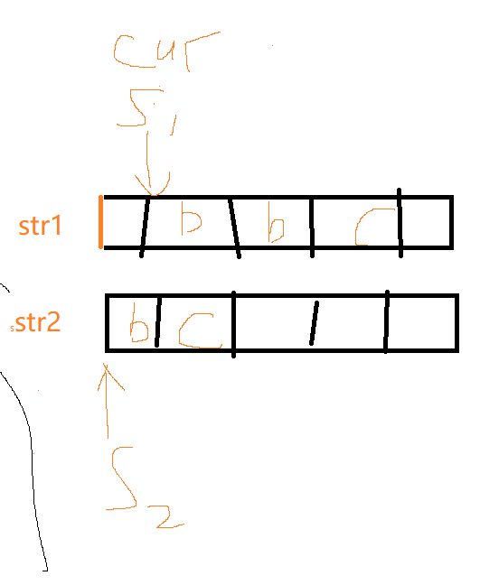 而s1,s2,用来比较是否符合,s1进入的位置即为 *cur == *str2 ,