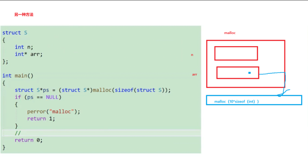 如果我们的代码是在⼀个给别⼈⽤的函数中,你在⾥⾯做了⼆次内存分配,并把整个结构体返回给⽤ ⼾。⽤⼾调⽤free可以释放结构体,但是⽤⼾并不知道这个结构体内的成员也需要free,所以你不能 指望⽤⼾来发现这个事。所以,如果我们把结构体的内存以及其成员要的内存⼀次性分配好了,并返 回给⽤⼾⼀个结构体指针,⽤⼾做⼀次free就可以把所有的内存也给释放掉。