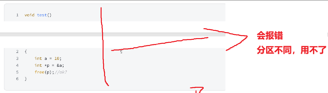 • 如果参数 ptr 指向的空间不是动态开辟的,那free函数的⾏为是未定义的。