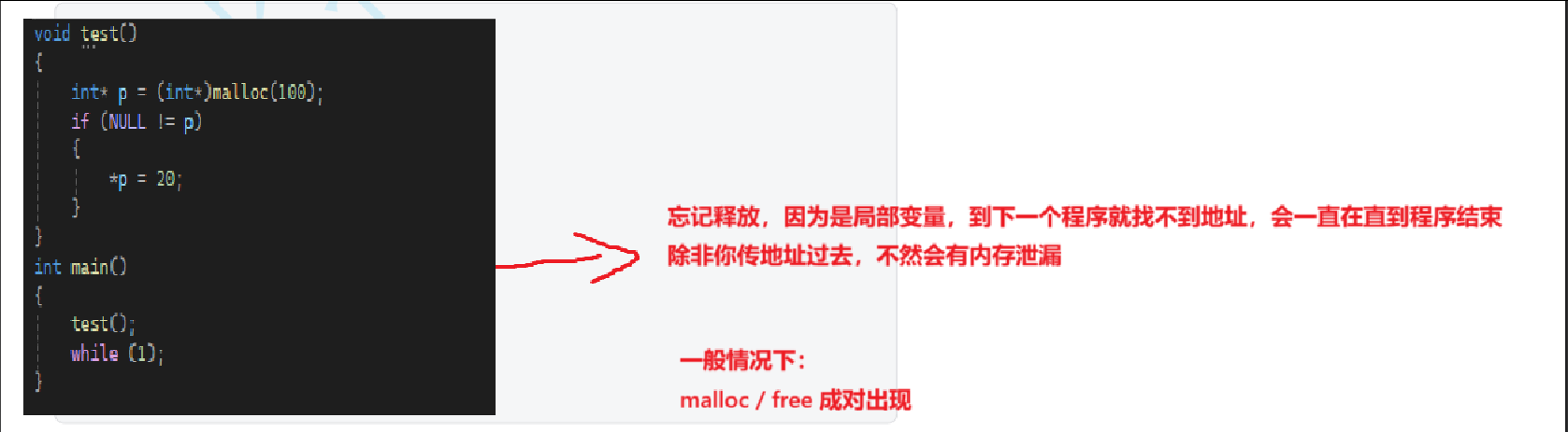 忘记释放不再使⽤的动态开辟的空间会造成内存泄漏。