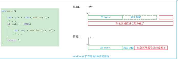 当是情况2的时候,原有空间之后没有⾜够多的空间时,扩展的⽅法是:在堆空间上另找⼀个合适⼤⼩ 的连续空间来使⽤。这样函数返回的是⼀个新的内存地址。