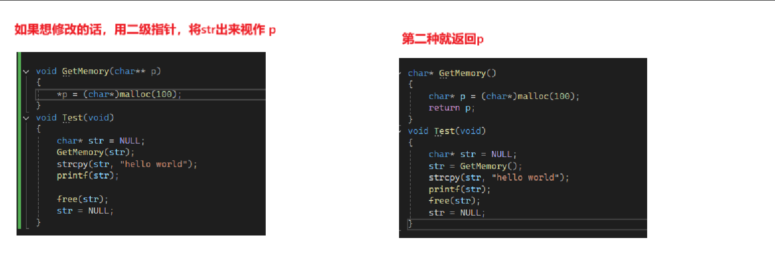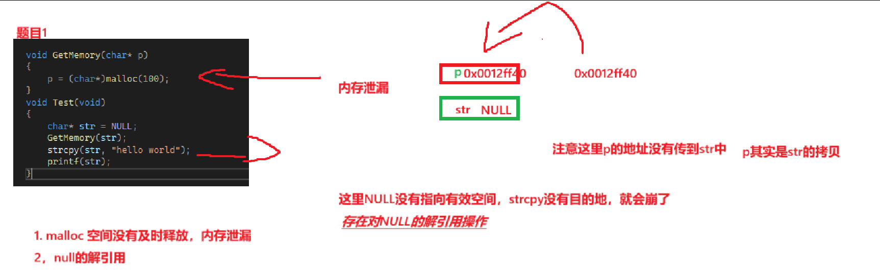 GetMemory(str) 调用时,str 的值(即 NULL)被复制给形参 p。此时 p 是 str 的一个副本,二者指向同一地址(NULL),但 p 和 str 是两个独立的指针变量。