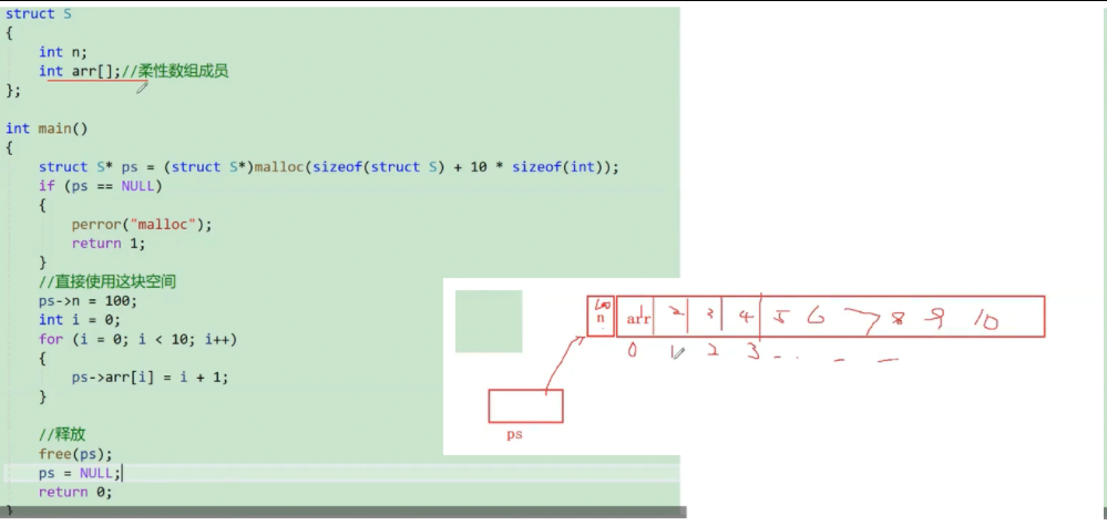 上面的代码,如果不使用柔性数据,就可以用两次malloc申请两次空间,