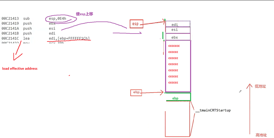 3. sub 因为栈区空间的创建从高地址到低地址,这里将 esp 的值减去 0E4H 相当于创建了空间