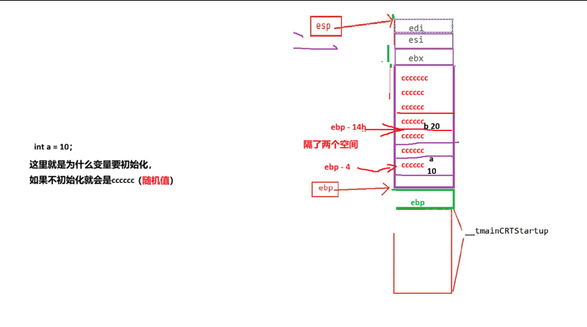 每个编译器里面放的内容不同,但总是会像这样对栈帧空间放东西进去,这就是为什么变量在使用的时候要进行初始化