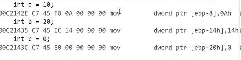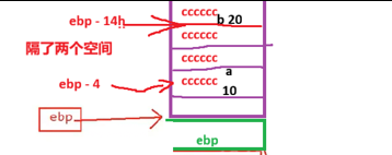 注意看这里,a 是在ebp-8 的位置创建, 而 b 是在 ebp - 14h 的位置创建,隔了两个空间