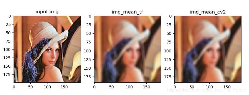 下面是在lena图像上进行的均值滤波对比实验(tf方法与opencv方法对比):