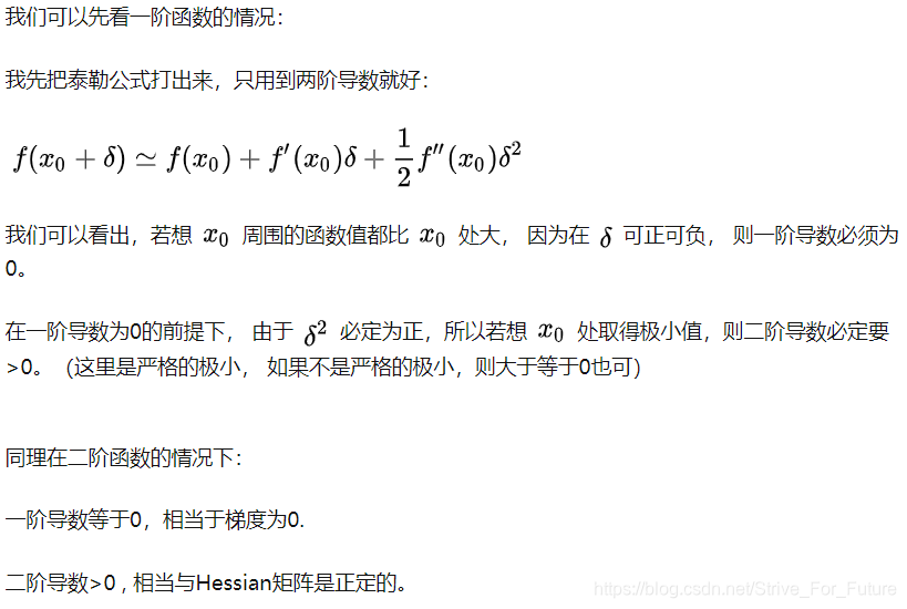 - 一阶导数向量等于0,Hessian正定(所有特征值都是正的),局部极小值。