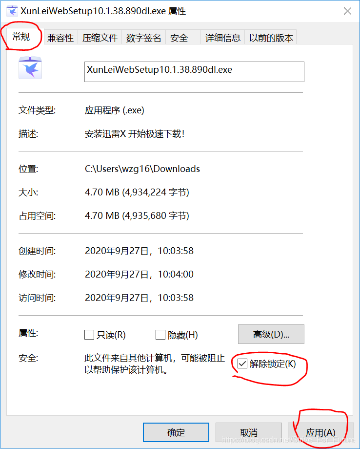 步骤:安装程序--》右键--》属性--》常规--》安全--》在“解除锁定”前面打勾--》应用。示意界面如下图所示。