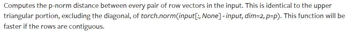简单翻译:计算输入中每对行向量之间的p范数距离。 这与torch.norm(input[:, None] - input, dim=2, p=p)的对角线以外的上部三角形部分相同。 如果行是连续的,此功能将更快。
