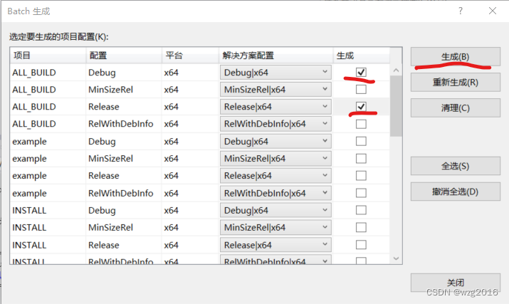 选择ALL_BUILD的Debug和Release, 然后点击“生成”,如下: