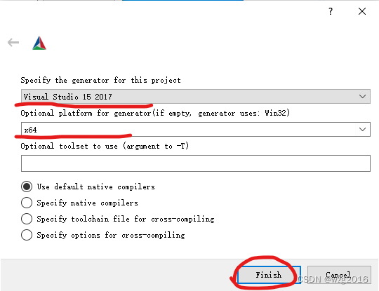 点击“configure”,弹出以下对话框,设置如下(要标注好是x64,否则会默认生成x32格式的,不能与其他x64的插件适配),然后点击“finish”: