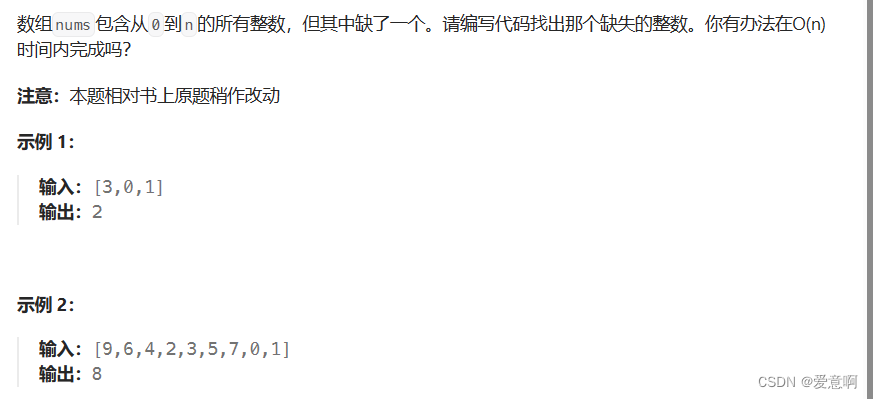 首先来简单看一下这道题。这道题就是告诉我们,给出一个数组nums,数组里面有n个数字,这n个数字的内容就是一个连续的0~n,这个数组不一定是按顺序来的,但一定是0~n的数字。比如0,1,2,3,4,5,6。但是在这个数组里面就缺少了一个数字。现在题目的要求就是让我们找出这个数字。