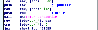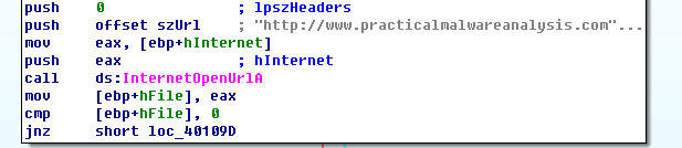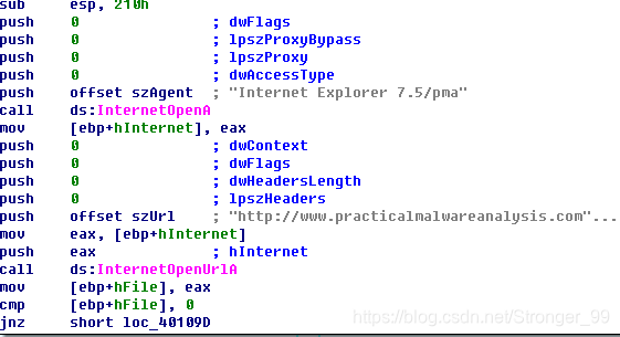 InternetOpenUrlA,这个函数用来打开“http://www.practicalmalwareanalysis.com”这个网址。然后与0 比较是否跳转。