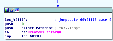 a分支调用了CreateDirectoryA函数,这是一个创建目录的函数,参数为“C:\Temp”,如果这个目录不存在,就会创建它: