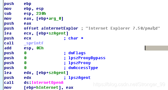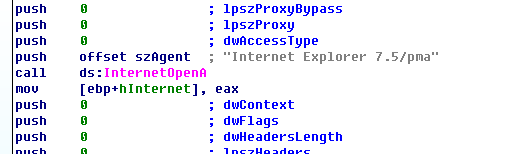 InternetOpenA,这个函数用于初始化。将“Internet Explorer 7.5/pma”字符串作为参数压栈。