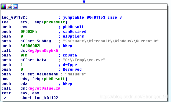 d分支调用了关于注册表的函数,它会将注册表中的Software\Microsoft\Windows\CurrentVersion\Run\Malware的值设置为C:\Temp\cc.exe。每当系统启动,恶意代码就会自动执行: